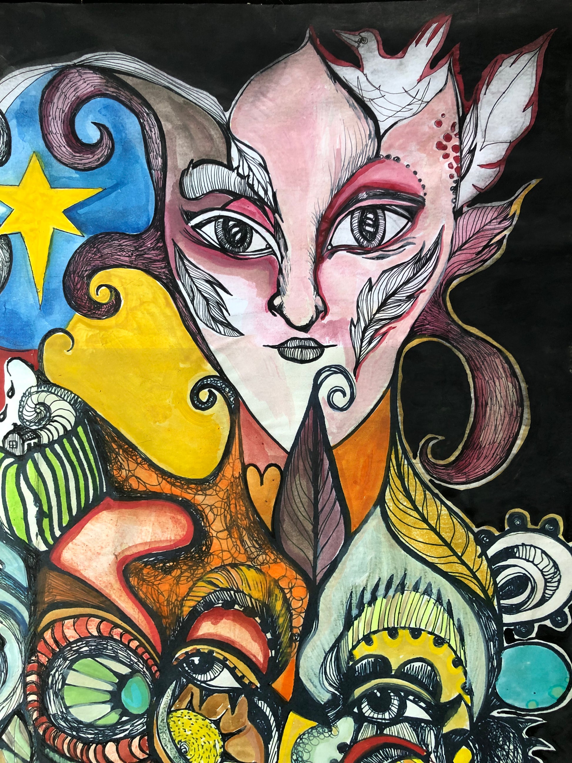 Trykk som er tegnet videre på og malt på med akvarellmaling. Det er på tynt papir. Er 60x60 cm. Og det finnes kun et eksemplar