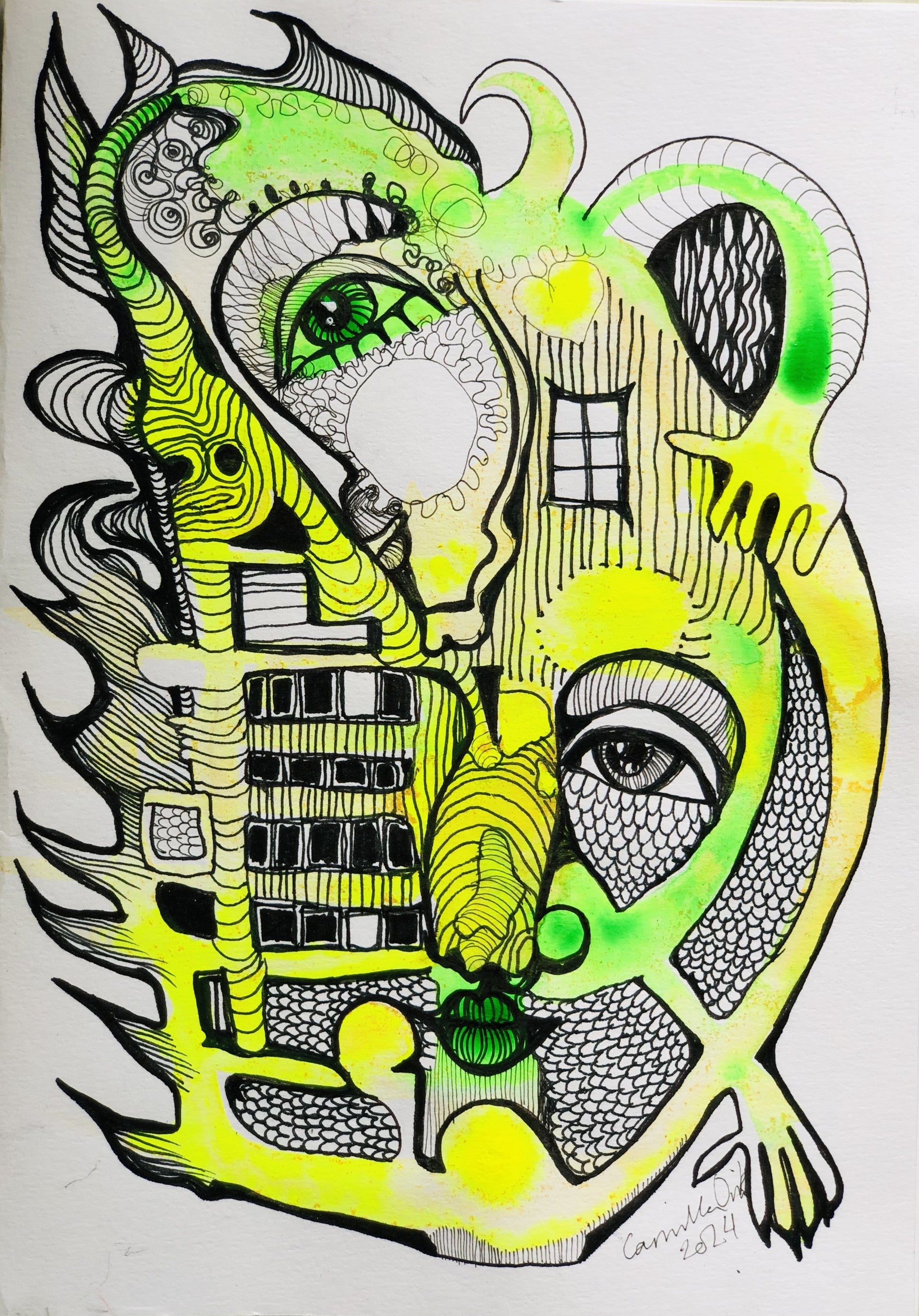 Dette er en tegning med blekk,tusj og penn på godt tegnepapir: